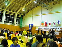 The Opening Ceremony took place at the leisure center "Yamizo" to which all the participants were transpoerted by a shuttle bus. The ceremony atarted with playing the Japanese national anthem, and greeting messages were given to the campers by Mr. Junzo Hasegawa, JAC President and the Chairman of the Rally, and Mr.Hisao Watahiki,Mayor of Daigo City. Then the FICC Asia-Pacific flag was raised to the music of Beethoven's 9th Symphony "The Ode to Joy".