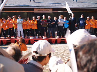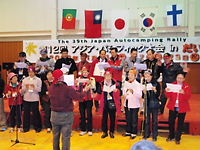At the Closing Ceremony on the last day, following the speech by the Chairman of the Rally, Japan Auto Camping Federation, The Camping Association of the Republic of China, Formosa Camping & Caravanning Club, Korea Camping & Caravanning Federation, and Daigo Green Villa were commended by FICC Asia-Pacific Commission for their greatest contribution to the success of this Rally. Also, in commemoration of the 12th Asia-Pacific Rally, Mr.Tadao Itoi and Mr.Kunikazu Ookubo were honored for having contributed for long time to the international friendship among Asian people. Finally a special award was given to Mr.Veijo Rahikainen who has participated in all the Asia-Pacific Rallies held in Japan from Finland since 1997. After the FICC Asia-Pacific flag was lowered to the music of Beethoven's "The Ode to Joy," the FICC Asia-Pacific flag was handed over to Formosa Camping & Caravanning Club, which is scheduled to host next year's Asia Rally. Finally, all the rally participants sang "Auld Lang Syne" arm in arm before saying goodbye.