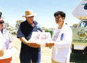 December 28 1995, we arrived Melbourne on 8:00 AM. Rented our caravans at Maui Company, we went to campsite. This place was chosen to be the site of the ninth national rally of Australia, located at about driving three and half hours away from Melbourne; twenty minutes north of Horsham. We passed the two kilometer newly paved road and arrived at the rally site. We were warmly welcomed by the rally chairman Ñ Mr. Brian Kelleher. He himself helped us check in and led to our camping territory. On the way to our territory, many first comers welcomed us by waving their hands, greeting words, shaking hands or even a big hug. We were all deeply touched.
