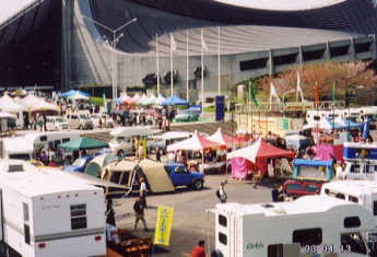 Japan Autocamping Federation held "Outdoor 2003" under the slogan of "Let's Go Autocamping!" on April 12 and 13. The venue was the open space in front of the National Yoyogi Stadiumin Tokyo. A lot of exhibitors from diverse fields such as camping utensils, automobiles, campsites, foods etc.were present. In the center of the place the Camping Village was set up where various programs were performed, such as lessons for craft and cooking as well as ocarina performance. A great number of visitors could spend an enjoyable days at the camping ground in the center of the megalopolice.