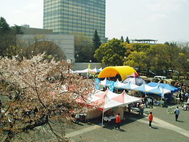 The event "Outdoor 2007", organized by Japan Auto Camping Federation, was held at Tokyo's Yoyogi Park Event Square on April 7 and 8, 2007. With cherry blossoms at bloom, the exhibition booths displayed camping products of Japan's most renowned outdoor manufacturers, caravans and motor caravans. The event also included fun programs such as bamboo craft, a log cutting competition and cooking class. Visitors also enjoyed a performance by the Andean music band and a joint performance of three drum sets on the outdoor stage. In the "Camp Village," built within the event site, the camping instructors brought their RV and tents so that the visitors enjoy a taste of the real camping.