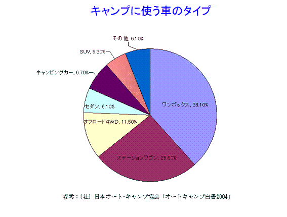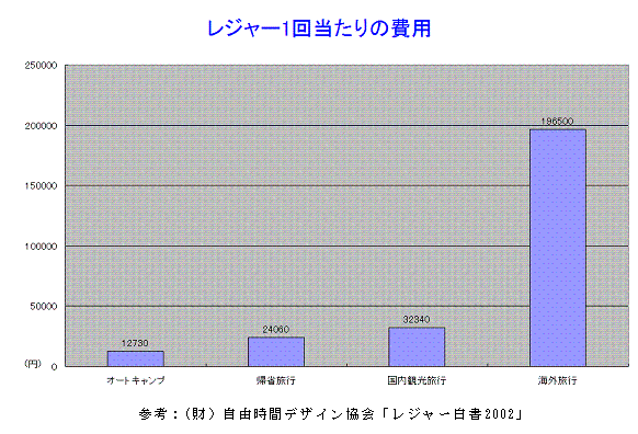 たとえ自分でテントを買ってもすぐに元を取れるのがオートキャンプ。「レジャー白書2002」によると、宿泊を伴うレジャーの1回当たりの費用を比較して見ると、オートキャンプは12730円で、帰省旅行24060円、国内観光旅行32340円、そしてもちろん海外旅行 196500円に比べてずっと安いことが分かります。