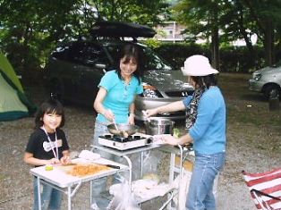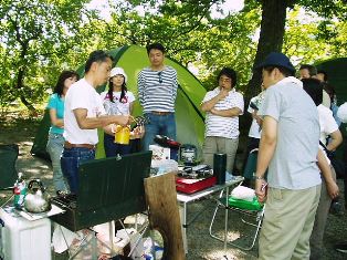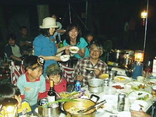 IFCCのメンバーは受講ファミリーとペアを組んでテントの立て方、キャンプ道具の使い方などをアドバイスしました。食事も一緒にメニューを考えて作りました。できあがった料理をビッグタープに持ち寄り夕食会。それぞれのファミリーが初めて野外で作った料理をお互いに楽しみました。