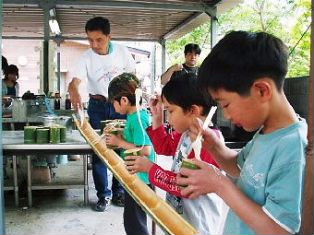 2日目の昼食はソーメン流しをしました。キャンプ場の竹を切り倒して樋と人数分の器を作り、水と一緒にソーメンを流しました。大人も子供も流れるソーメンを割り箸ですくい取って、おなかいっぱい食べました。