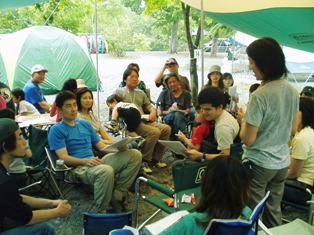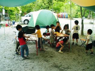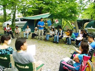 教室は12時から開始。最初に9歳を最年長とする23人の子供チームを編成。リーダーとサブリーダーを決めて、自分たちでルールを守って遊ぶことにしました。大人たちは青空の下に輪になって座り、全員自己紹介をしたあと、ファミリーキャンプとは何かという基礎から、キャンプ用具の使い方、キャンプ場の利用の仕方などについて講習を受けました。