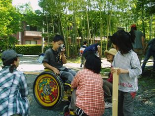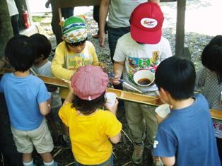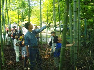 2日目は朝食の後、キャンプ場内の竹を切り倒してクラフト教室をしました。そのあとで樋と人数分の器を作り、ソーメン流しをしました。水と一緒にソーメンを流すと、子供たちはわいわい騒ぎながらソーメンを割り箸ですくい取って食べました。