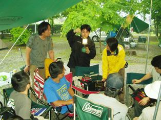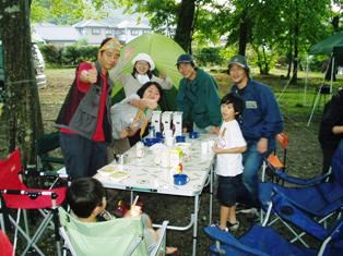 夕食を準備する頃には雨もやみ、共通課題のカレーとシチューのほか、それぞれのペアの好きな料理を作って食べました。夕食後、子供たちは手に手に懐中電灯を持って、リーダーを先頭に1列になってキャンプ場内を「探検」しました。大人はビッグタープにお酒と料理を持って集まり、キャンプ談義に花を咲かせました。