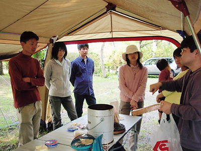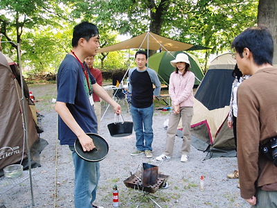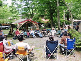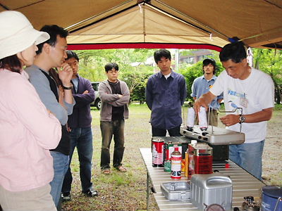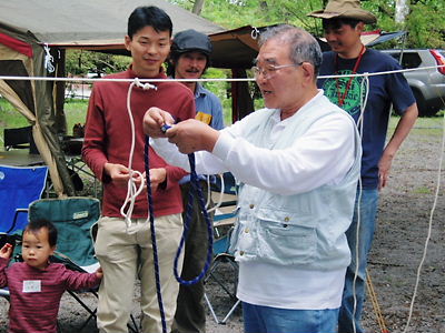 初日は順番に受付を済ませてから、スタッフのアドバイスを受けながらテントの設営をしました。午後1時からいよいよ講習の開始。前半の座学は屋外に円陣を組んでキャンプ入門、ファミリーキャンプの楽しみ、キャンプ場の利用の仕方などについて講習を受けました。後半の実技編ではキャンプ用具の使い方、キャンプに役立つロープワーク、ダッチオーブンの使い方、燻製の作り方を学びました。