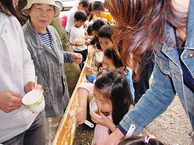 日曜日はすがすがしい快晴。朝食を食べてから、テントのたたみ方やキャンプ道具の片付け方などを学びながら撤収しました。11時からみんなでキャンプ場内の竹を切り倒してソーメン流しの準備をしました。水場に竹の樋を設置して、水と一緒にソーメンを流すと、子供たちは大喜びでソーメンを割り箸ですくって食べました。