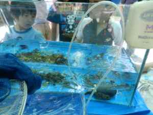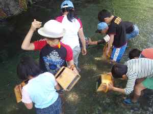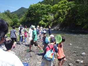 2日目の日曜日は朝から晴天。ビュッフェスタイルの朝食を取った後、キャンプの撤収の仕方を学びました。10時から名栗川(入間川)で水遊びを行ないました。子供たちは腰まで水に入り、箱メガネを使って清流にすむカジカ、ハヤ、ヤマメなどを観察したり、カニやゲンゴロウなどの水棲生物を捕まえたり、夢中になって遊びました。