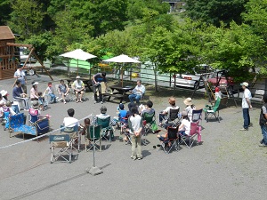 天候に恵まれ初日の土曜日はまるで真夏のような暑さ。10時に受け付けを開始し、各自昼食を済ませた後、13時から講義が始まりました。主催者の挨拶と簡単な自己紹介のあと、「ファミリーキャンプについて」、「キャンプ場の利用の仕方」の座学に続いて、キャンプ道具の使い方、キャンプで寝る技術、正しいバーベキュー、ダッチオーブン、ロープワークなどの実技指導を行ないました。