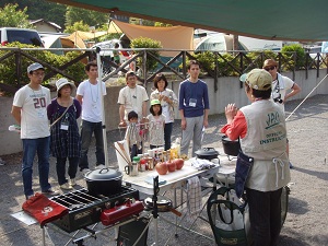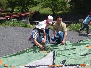 2002年から毎年開催しているIFCC主催「みんなのキャンプ教室」。会場は昨年とおなじ埼玉県飯能市にあるケニーズ・ファミリー・ビレッジ。4月1日にホームページで募集を開始したところ5日目に定員の8家族に達しました。迎える指導員はキャンプ場スタッフを含めて12人。1泊2日24時間のキャンプ体験を通して、テントの張り方、キャンプ道具に関する知識と扱い方、キャンプ場の利用の仕方、マナーやルール、安全上の注意、環境に対する配慮などを学びました。また指導員の家族や他の参加者との交流、川遊びイベントなどでキャンプの楽しさを実感してもらいました。