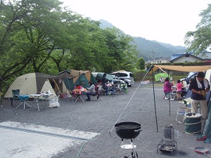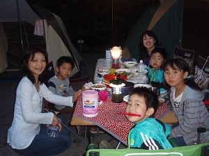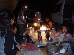 夕飯はそれぞれのグループに分かれて豚丼を作りました。お父さんが中心になり、子供たちも肉を切ったり玉ねぎの皮を剥くなどして手伝いしました。夜の懇親会は集合テントに集まり消灯時刻の11時まで和やかに歓談しました。