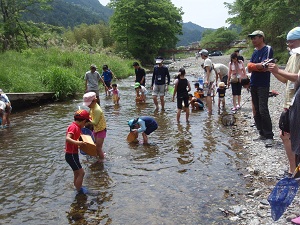 2日目の日曜日も朝から晴天。ビュッフェスタイルの朝食を取った後、キャンプの撤収の仕方を学びました。10時から名栗川(入間川)で水遊びを行ないました。子供たちは箱メガネを使って魚を観察したり、網でカエルやカニなどのを捕まえたり、時間がたつのも忘れて遊びました。