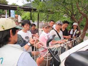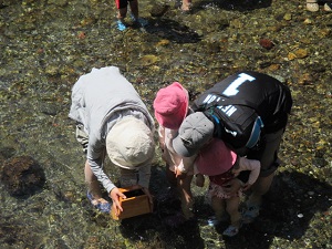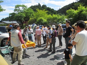 IFCC主催「みんなのキャンプ教室」は5月17日(土)~18日(日)に埼玉県飯能市にあるケニーズ・ファミリー・ビレッジで開催されました。4月1日にホームページで募集を開始したところあっというまに定員の8家族に達したので、定員を急遽10家族に増やしました。なかには1年待って福島から参加したという家族も。2日間とも天候に恵まれ、初日の土曜日はテントの張り方、キャンプ道具に関する知識と扱い方、キャンプ場の利用の仕方、キャンプ料理、ロープワークなどを学びました。夜の懇親会ではお酒やつまみを持ち寄り和やかに歓談しました。翌日の日曜日は撤収後、名栗川で箱メガネを使って魚を観察したり、網で小魚やカニを捕まえて遊びました。