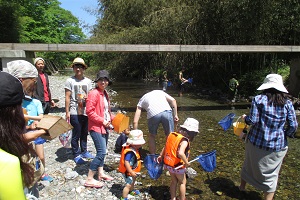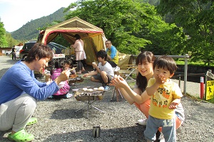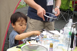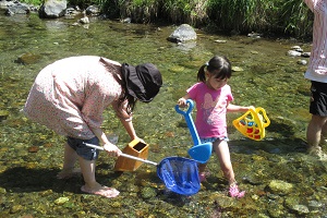 2日目の日曜日は朝から晴天。朝食は炭火でホットドッグを作りました。テントや道具を全部片づけたあと、名栗川に降りて水遊びをしました。真夏のような暑さのため、子供たちは水着に着替え、箱メガネを使って魚を観察したり、網でカエルやカニなどを捕まえたりして遊びました。