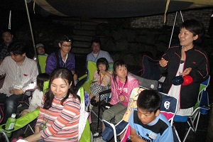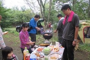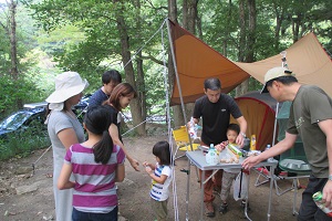 夕飯はそれぞれのグループに分かれて豚丼を作りました。お父さんが中心になり、子供たちも肉を切ったり玉ねぎの皮を剥くなどして手伝いしました。夜の懇親会は集合テントにそれぞれお酒やおつまみを持ち寄って和やかに歓談しました。