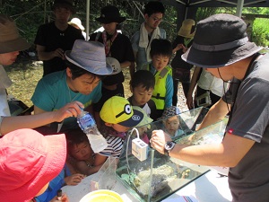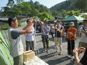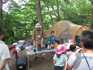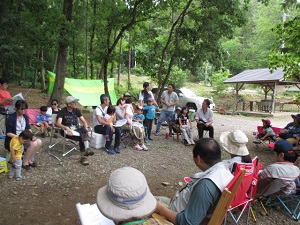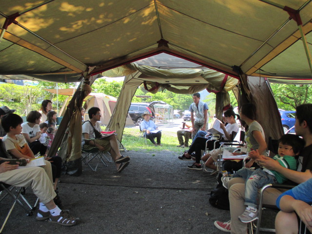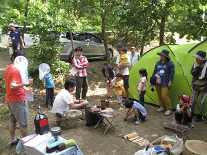 今年16年目を迎えたIFCC主催「みんなのキャンプ教室」は、第1弾を5月20/21日に埼玉県飯能市にあるケニーズ・ファミリー・ビレッジで実施しました。今年も人気が高く、募集開始後6日目に定員の8家族に達しました。受講者と指導員の家族合わせて40人が参加。1泊2日のキャンプを通して、テントの張り方、キャンプ道具の扱い方、薪割り、火起こし、ロープワーク、野外料理などを楽しく学びました。日曜日は夏日の炎天下、名栗川で水浴びをしたり、網で魚やカワムシやカエルなどを捕まえたりして遊びました。今回の特徴は子供14人のうち3歳未満の乳幼児が6人もいたことです。最後の振り返りでは「子供が小さいので不安だったけれど、他の子供たちと一緒にキャンプを楽しんでいるのを見て安心した」という感想もありました。