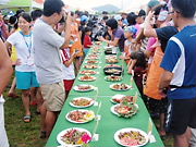 会場の中央広場では、クッキングオリンピックが開催されました。主催者から与えられた牛肉と野菜を使って制限時間内に料理を1品つくるというものです。何しろ優勝の景品は韓国かルビ500ドル分というので、各国から料理自慢が33人参加して腕を振るいました。