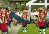 大会会場から約2キロメートル離れた鯉魚潭湖畔で行われた開会式では台湾キャンピング&キャラバニング・クラブの陳盛雄会長や来賓の挨拶に続いて、FICCの会長がスピーチをして大会の開会を宣言しました。するとFICCの旗をひらめかせたモーターボートが現れ、湖を2、3周したあと、岸に運びました。それを華やかな衣装をまとったアボリジニの5人の女性が受け取ると、朗詠しながらメインポールまで運び、酒で周囲を清める儀式を行ってから、ボーイスカウトに手渡しました。FICC旗はベートベンの第9交響曲「歓喜の歌」のメロディーに合わせてメインポールに掲揚されました。