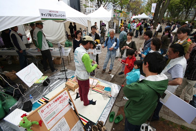 アウトドアシーズンの開幕を告げるイベント「アウトドアデイジャパン2013」が4月6/7日、東京の代々木公園イベント広場で開催され、会場には2日間で8万2300人のアウトドアファンが訪れました。テントメーカーを初めとするアウトドア用品ブースでは、実際のテントなどのキャンプ用品を見るだけでなく、アウトドア用品を使ったクラフト教室やクッキング教室などの実演が行われました。自動車メーカーブースでは、トヨタのオフロード体験、スバルのアイサイト試乗などが行われました。渋谷駅と代々木公園を結ぶけやき並木に指導者コーナーを設け、スモーク教室、トレーラー展示、バンコン展示、ネイチャークラフト、レザークラフト、ロープワーク教室、キャンプ何でも相談、キャンプ場パンフレット配布を行いました。